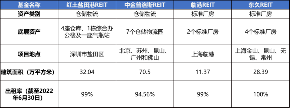 红土盐田港REIT底层资产为现代物流中心项目,位于深圳市盐田区,截至2022年6月30日,底层资产平均出租率约99%;中金普洛斯REIT底层资产由7个仓储物流园组成,分布于京津冀、长三角、大湾区三大城市群,建筑面积合计约704,988 平方米。截至2022年6月30日,底层资产合计平均出租率约94.56%;临港REIT底层资产由位于上海临港的2个标准厂房组成,截至2022年6月30日,底层资产合计平均出租率约99%;东久REIT底层资产由4个标准厂房组成,分别位于上海金山、昆山、无锡、常州,截至2022年6月30日,底层资产合计平均出租率约99%。